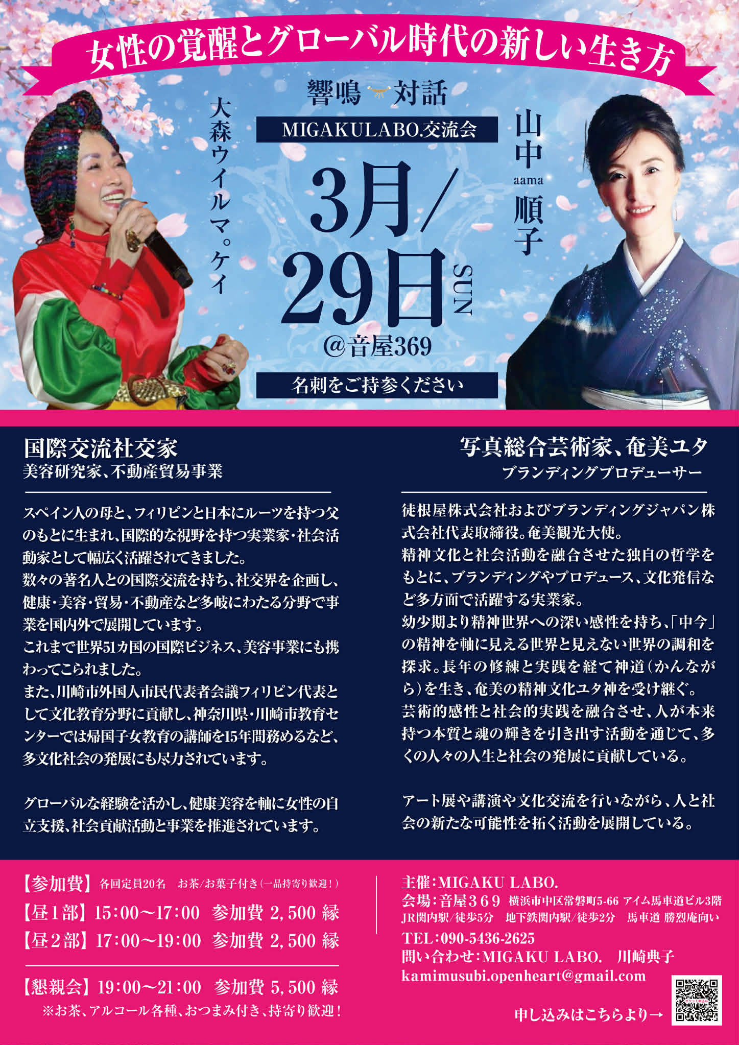 お知らせ/イベント情報 2026年3月29日(日)女性企業家対談 2026年3月24日 by speedsadmin 3月29日(日)女性企業家対談国際的に活躍されてきたウィルマ・ケイさんと、音屋369のceo 山中順子が対談。 昼、夜、交流会を定期開催です。